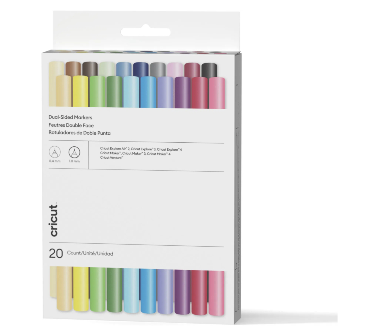 Features: Includes: 20 Dual-Sided Markers in popular colors. Dual-Sided: Includes 0.4 mm fine point pen &. a 1.0 mm marker tip. Great for: Writable vinyl, paper, Smart Label, and more. Fast Drying & No Bleed: Ink dries quickly without bleeding for crisp, clean lines. Versatile: Write and draw in various fonts and styles with tons of content in Design Space. Designed for Safety: Water-based, acid free, non-toxic; conforms to ASTM D-4236. Optimized for Cricut: Engineered for maximum performance with Cricut Explore machines (Cricut Explore One requires adapter, sold separately), Cricut Maker machines, and Cricut Venture.